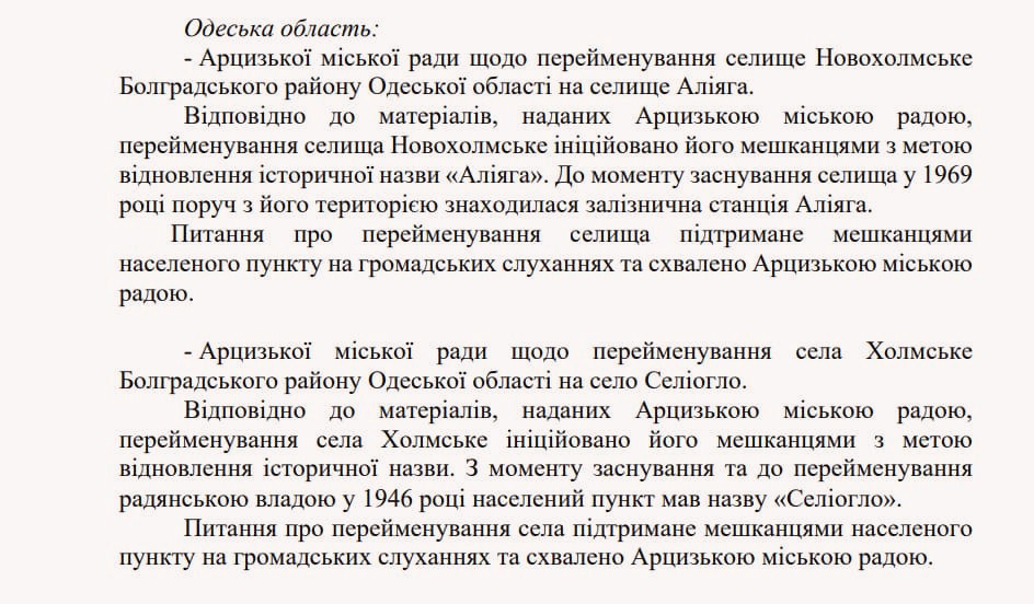 The renaming of the village of Holmske was initiated by its residents, who wish to restore the historical name Selioglo. This name was used from the founding of the settlement until it was changed by Soviet authorities in 1946.