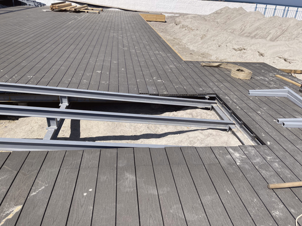 Reinforced concrete ramps and beach boards have been manufactured and delivered, along with fencing elements for the retaining wall.