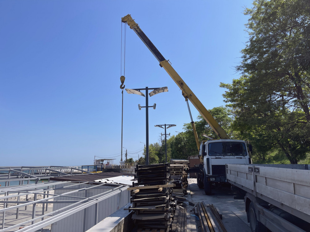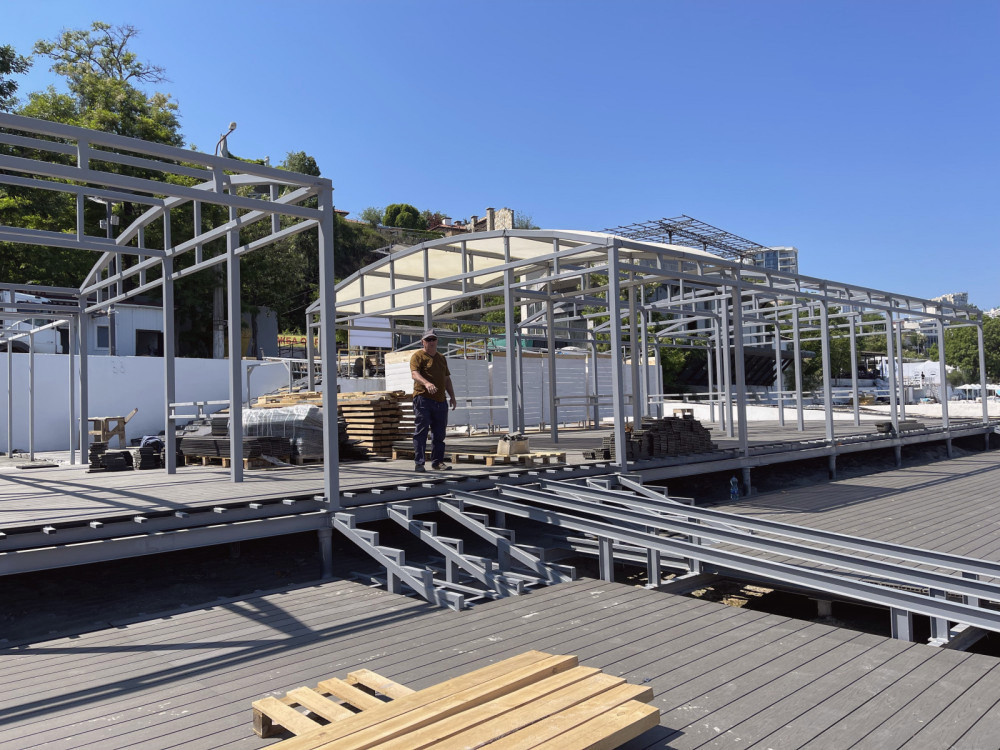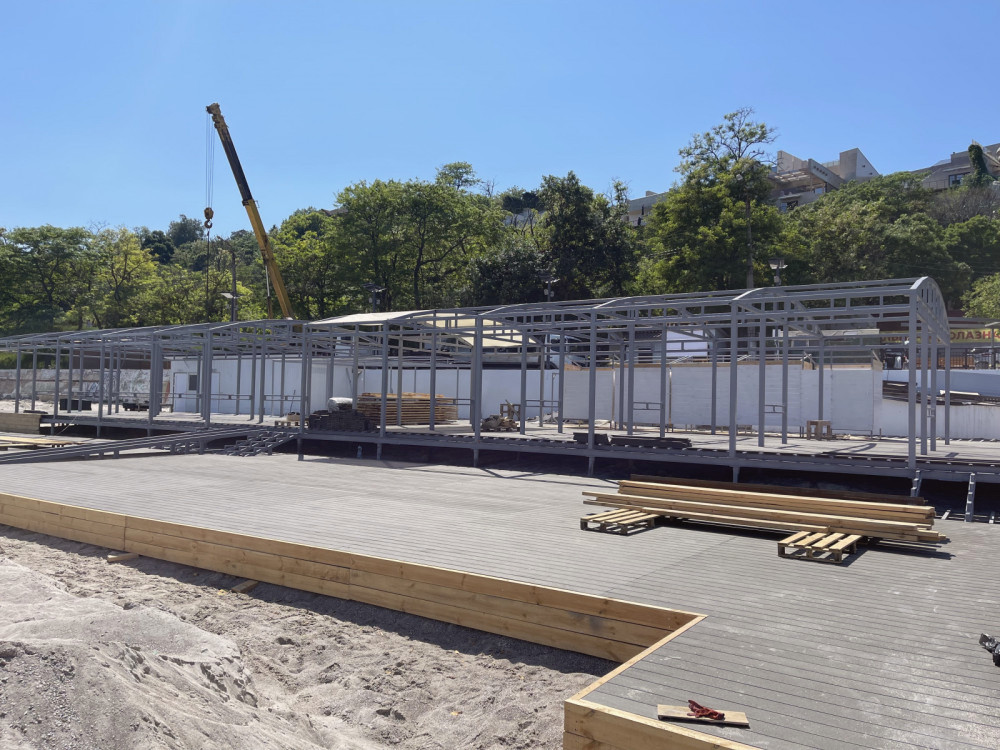 Currently, a metal framework and terrace boardwalks have been installed on the beach, along with safety fence elements; a metal ramp for easy access to the sea is being assembled and installed.