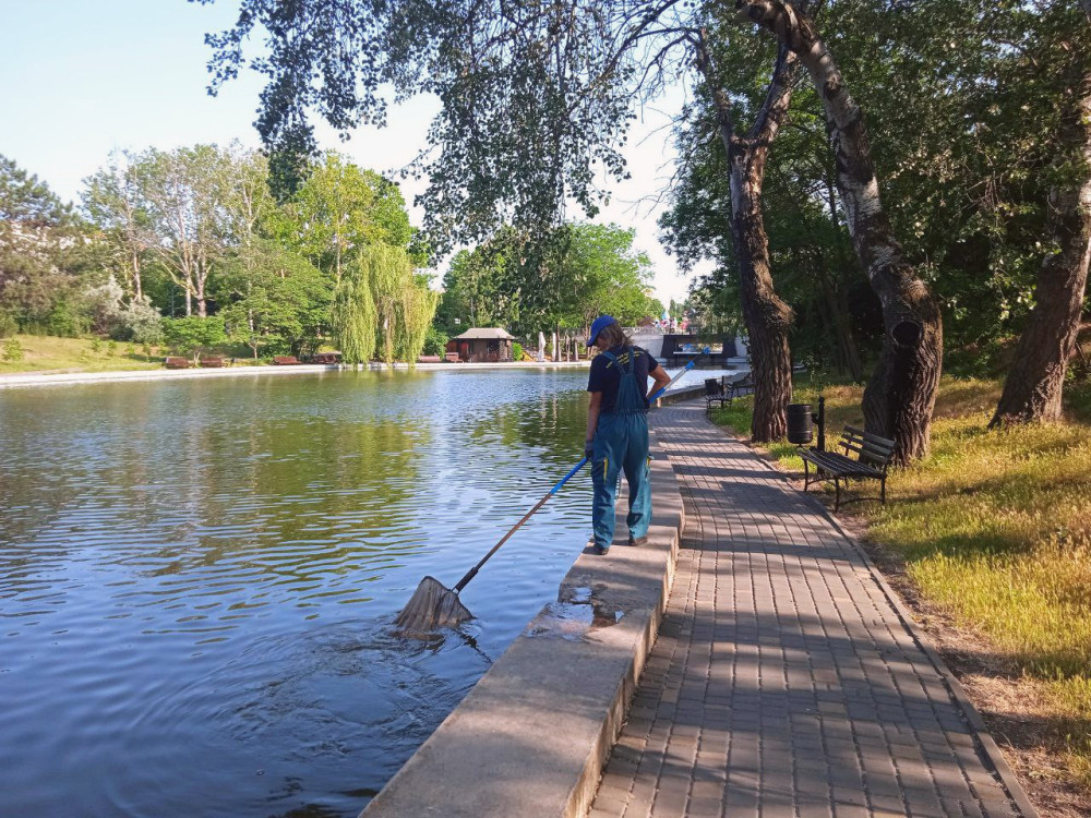 Workers from the Municipal Enterprise «Service Center» diligently clean nearly two kilometers of shoreline around the ponds at Victory Dendropark in Odessa every day.