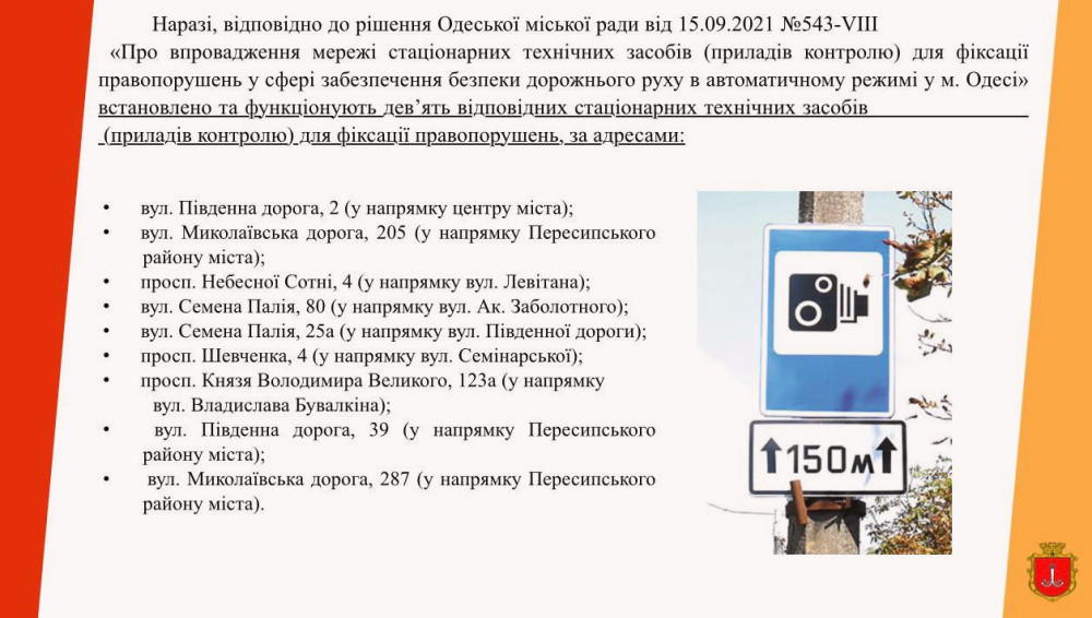 Після спільного дослідження місць з високою концентрацією ДТП, яке проводили представники Національної поліції, Департаменту транспорту Одеської міськради та інших відповідних організацій, було визначено чотири нових локації для розміщення камер автоматичного контролю порушень.