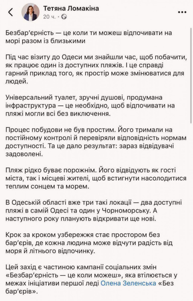 Цей пляж демонструє, як змінюється середовище для людей. Таку думку висловила радниця Президента України з питань безбар'єрності Тетяна Ломакіна після свого візиту до Одеси. Вона відзначила успіхи міста в облаштуванні інклюзивного пляжу на 11-й станції Великого Фонтану, підкресливши, що реалізація проекту контролювалася на всіх етапах.