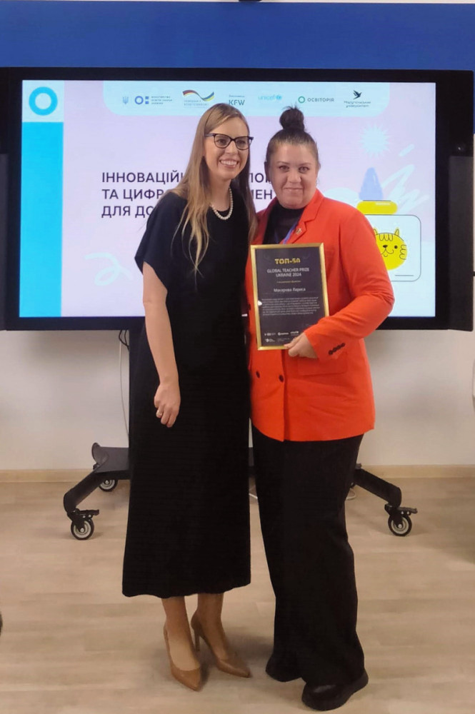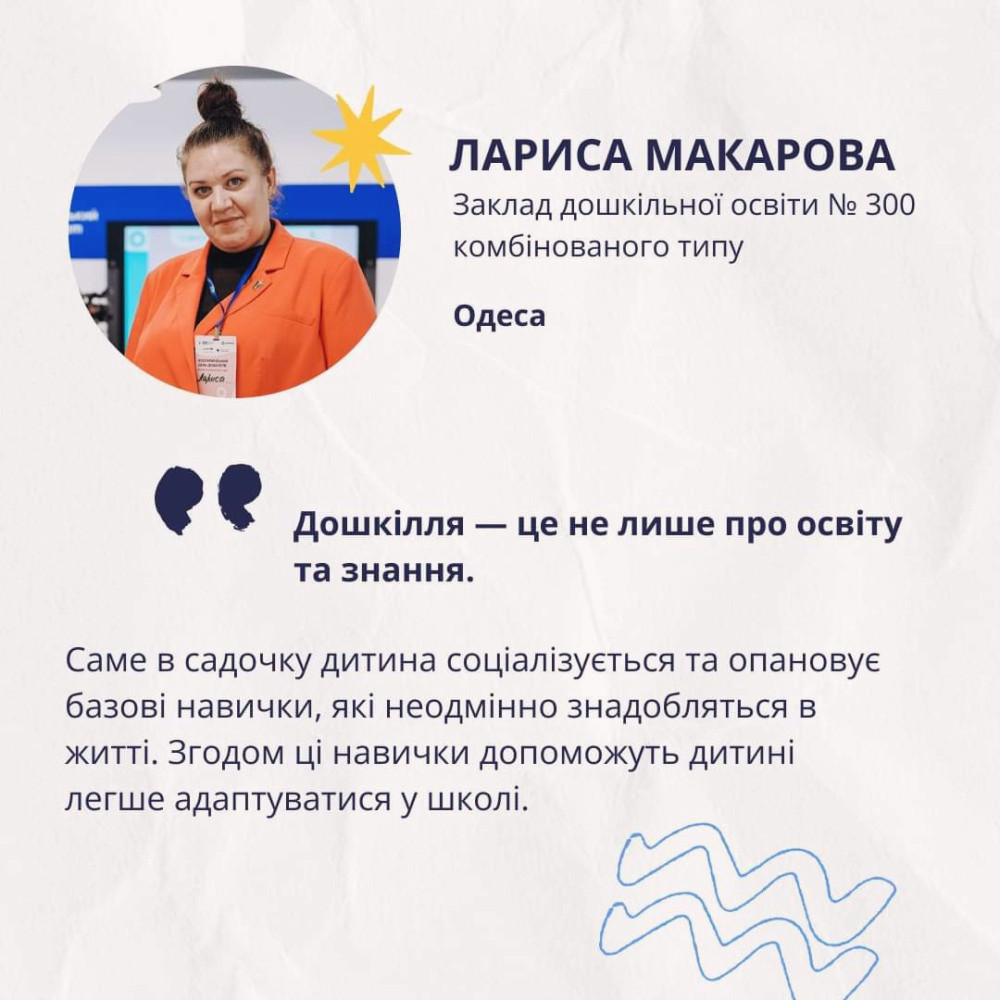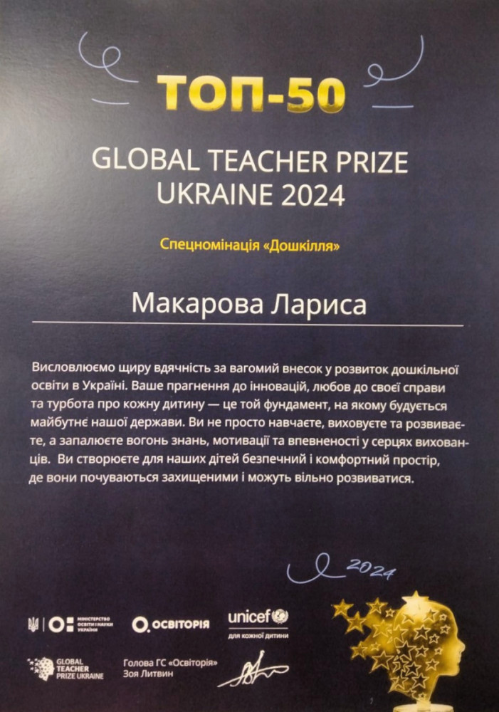 Лариса Макарова, вихователька-методистка з Одеського закладу дошкільної освіти «Ясла-садок» № 300, потрапила до списку ТОП-50 вихователів за версією Global Teacher Prize Ukraine - 2024 у номінації “Дошкілля”.